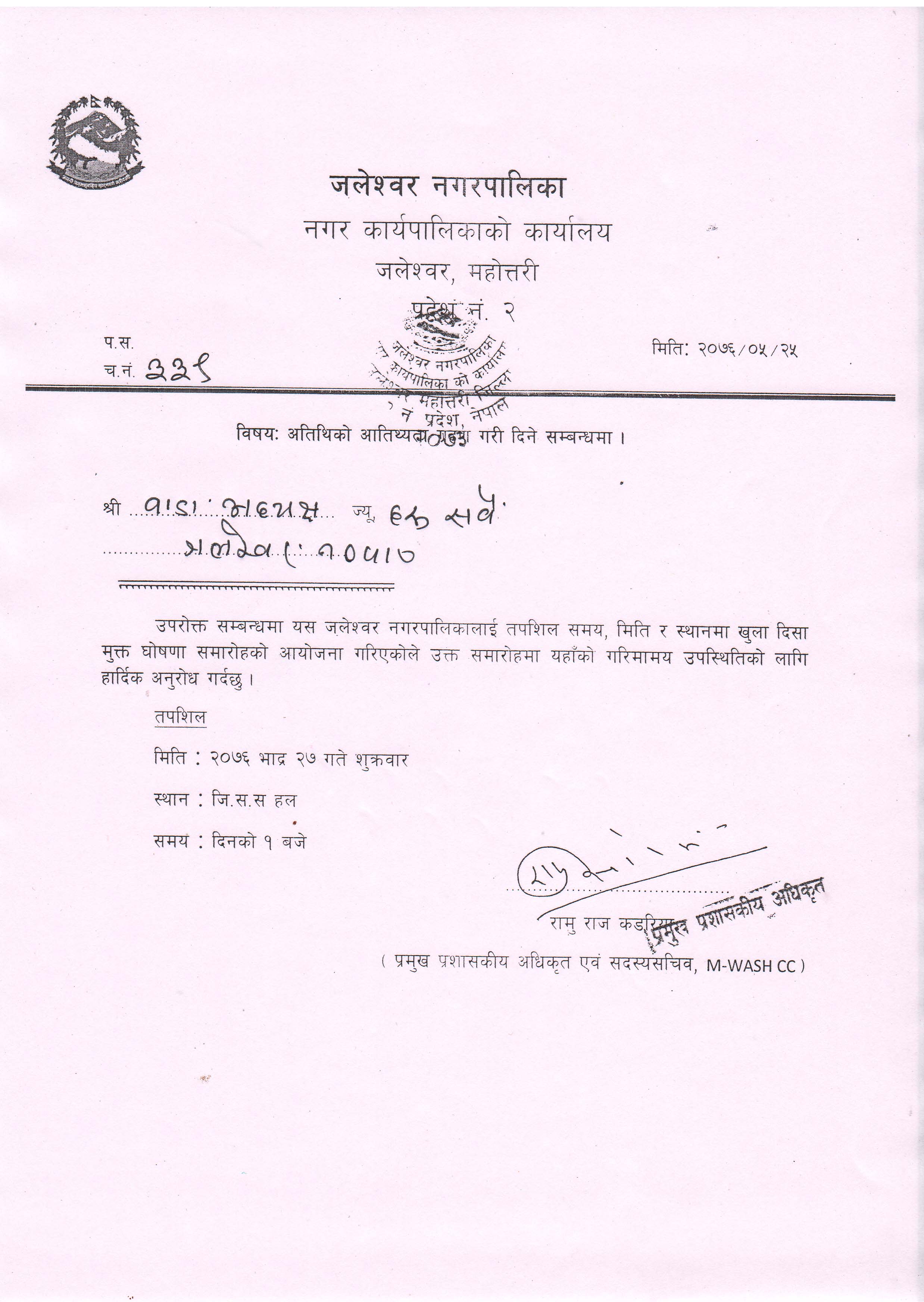 अतिथिको आतिथ्थता ग्रहण गरी दिने सम्बन्धमा