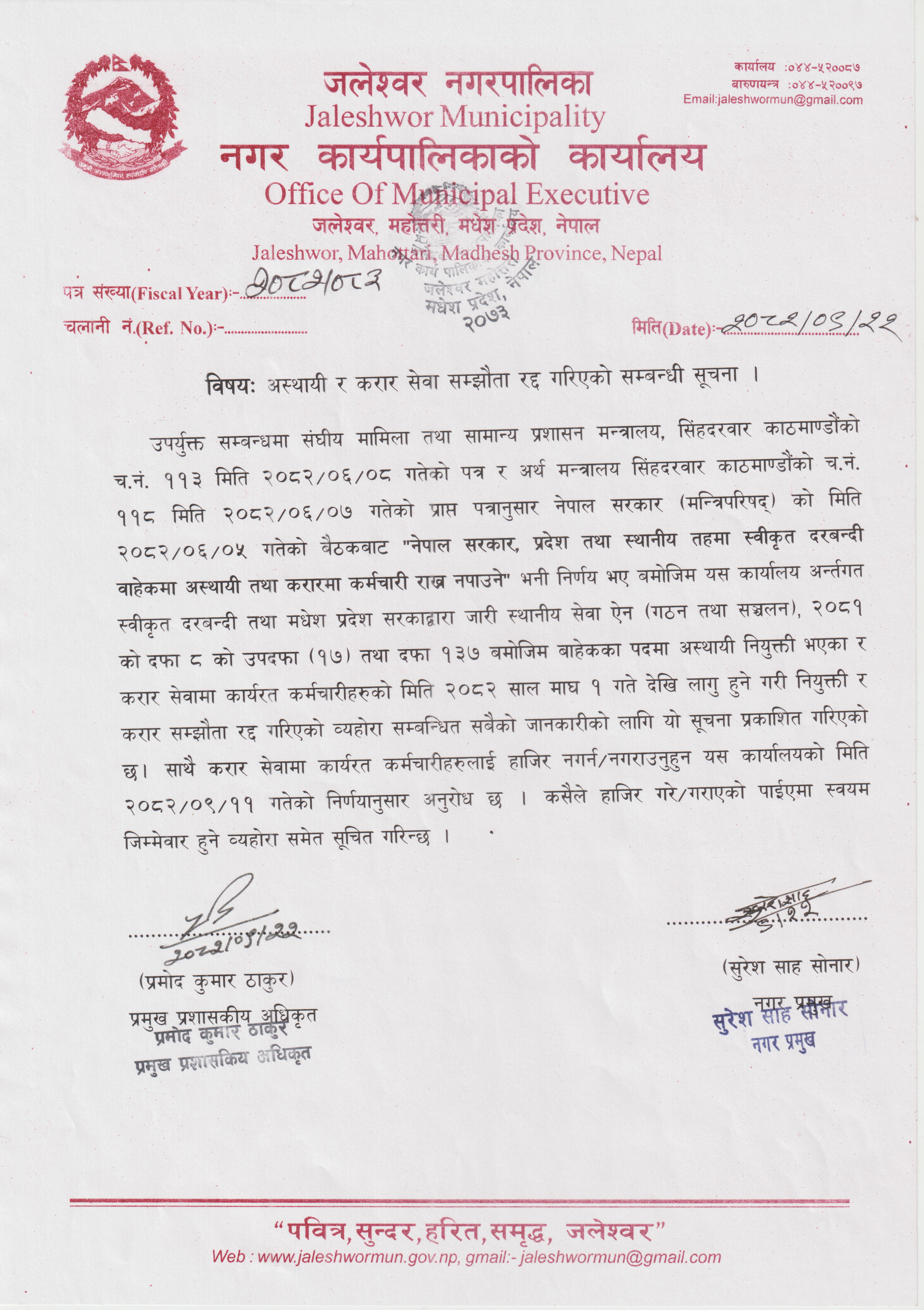 अस्थायी र करार सेवा सम्झौता रद्द गरिएको सम्बन्धी सूचना