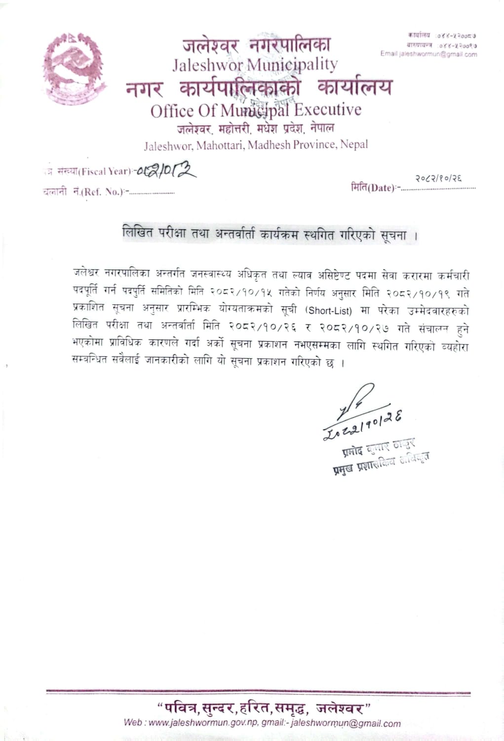 लिखित परीक्षा तथा अन्तर्वार्ता कार्यक्रम स्थगित गरिएको सूचना